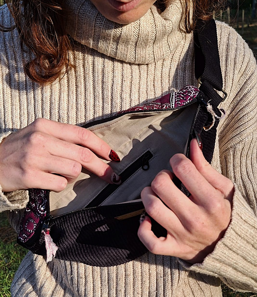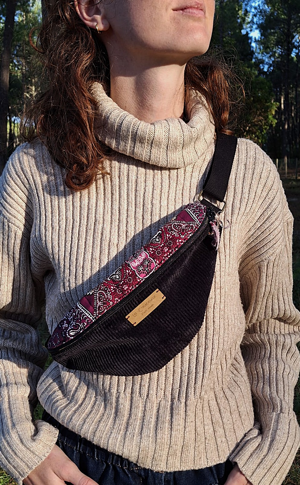 Cette mini banane associe la chaleur du tissu paisley matelassé à l’élégance du velours côtelé noir. Ensemble, ils créent un modèle à la fois discret et singulier, idéal pour accompagner les tenues de tous les jours.